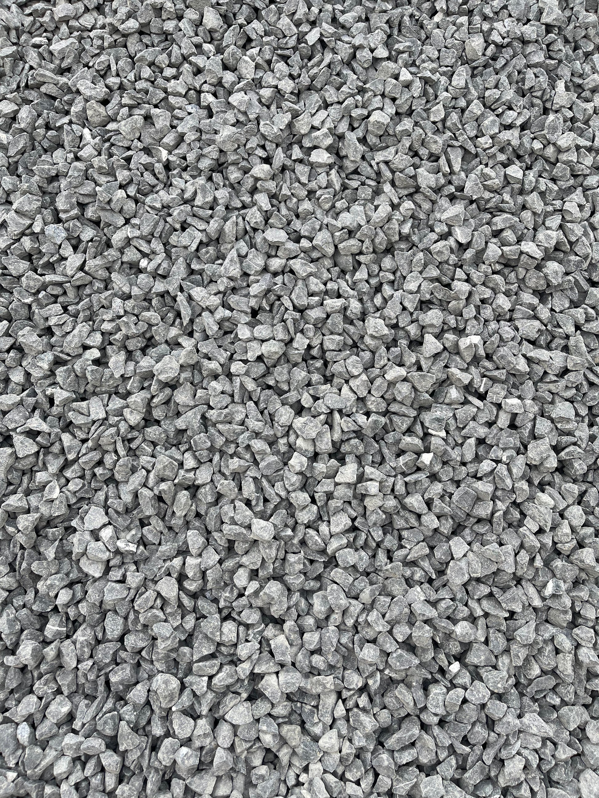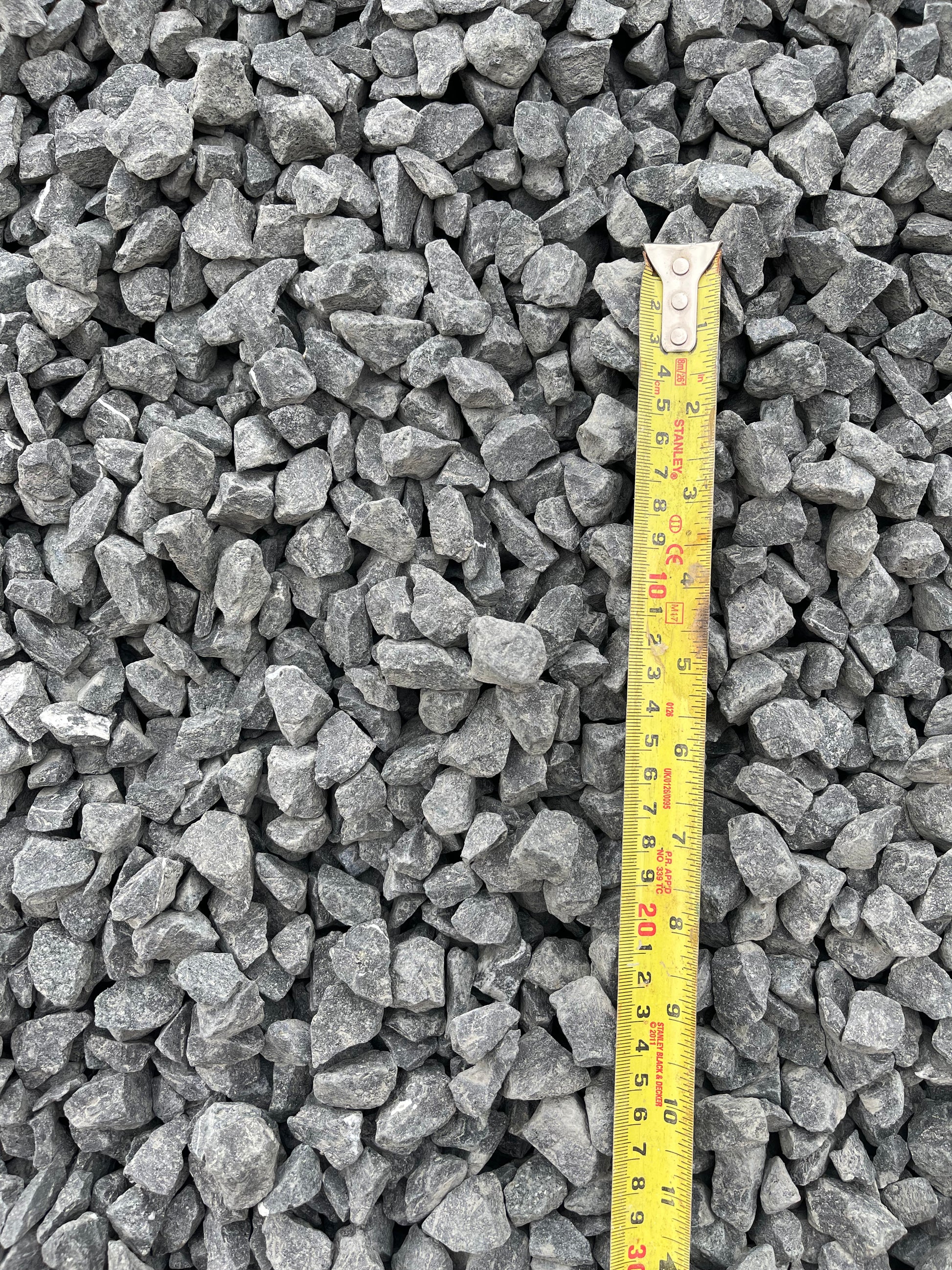 Crushed basalt gravel with dark grey look and very black look when wet.